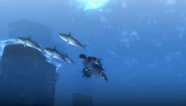 水中での交戦はまあ置いといて(爆、水泳ができること自体がめちゃ素敵。プロモーションムービーの飛び込みシーン見られました?あ、WiiGのtri-体験版じゃ当たり前にある光景なのか。水際までタタタッて走って行ってヒョイッと海に飛び込んで行くのは海の子!って感じで気持ちがいいですねー。なんでも街の水中闘技場も使われていない間は水泳が可能だとか(笑。
